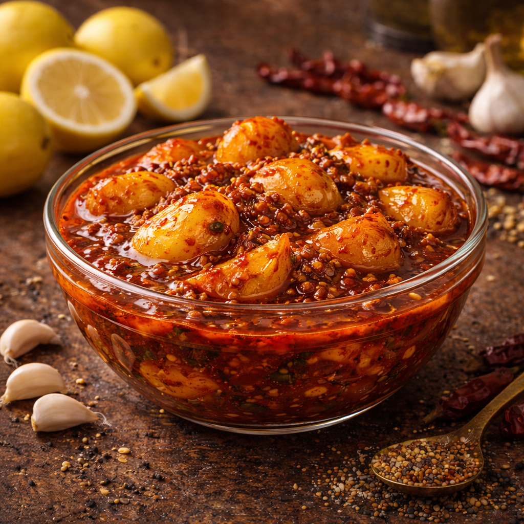 Athamma Pickles Lemon Pickle is prepared using fresh, juicy lemons combined with carefully selected spices and traditional seasoning methods. The lemons are cured naturally to bring out their signature tangy taste, then blended with spices to create a perfectly balanced and flavorful pickle.