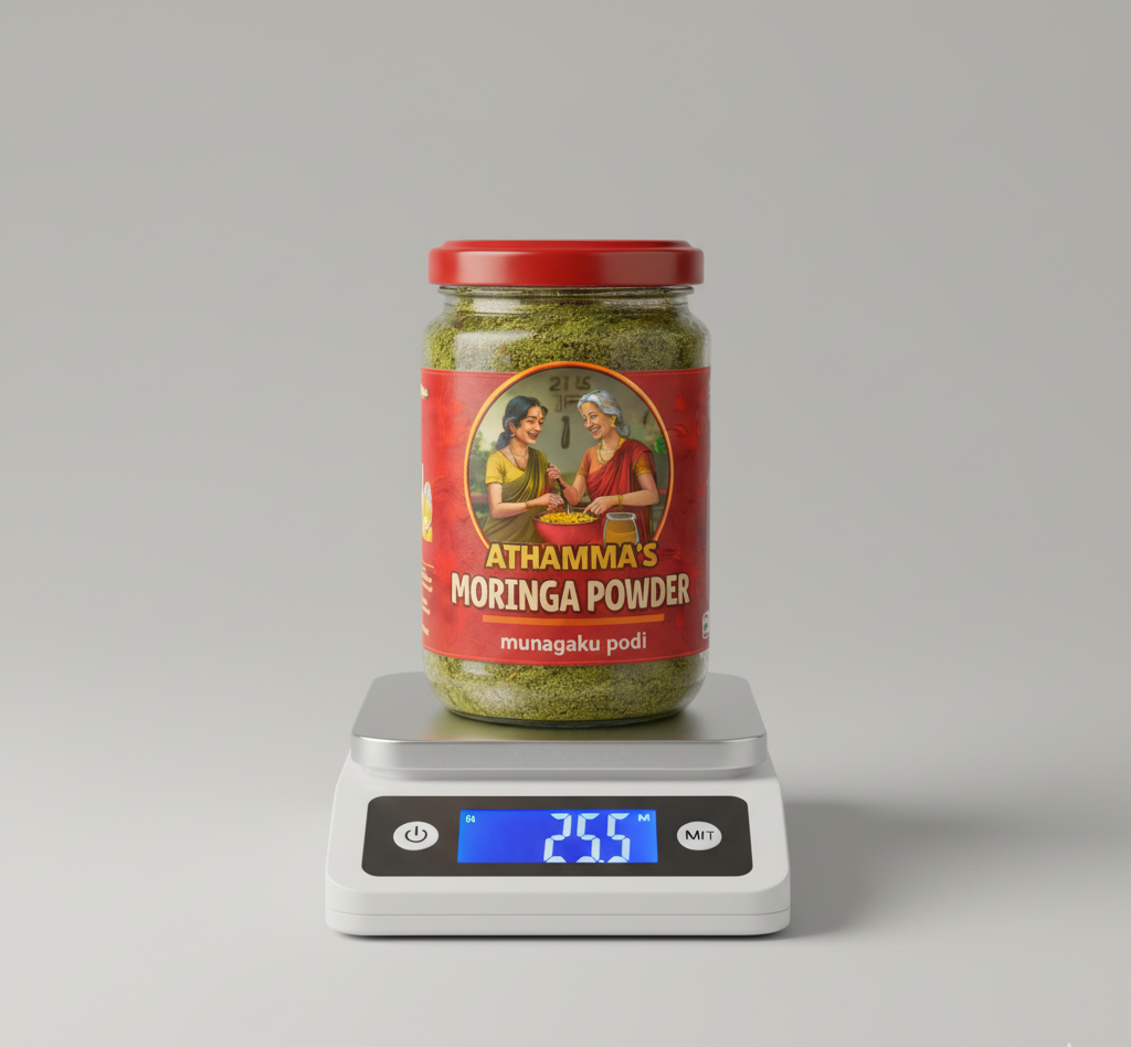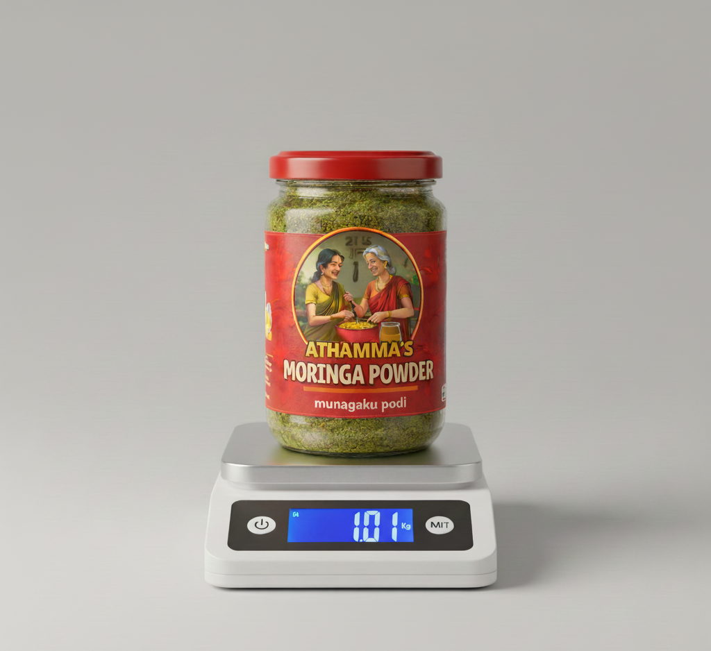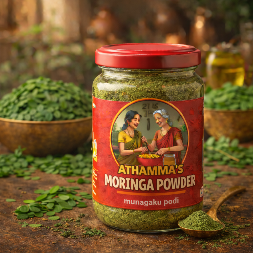 Athamma Pickles Munagaku Podi (Moringa Powder) is prepared using fresh moringa (drumstick) leaves, gently dried to preserve their natural aroma and flavor. The leaves are then blended with traditional spices and ground to a fine texture, resulting in a podi that is both flavorful and comforting.