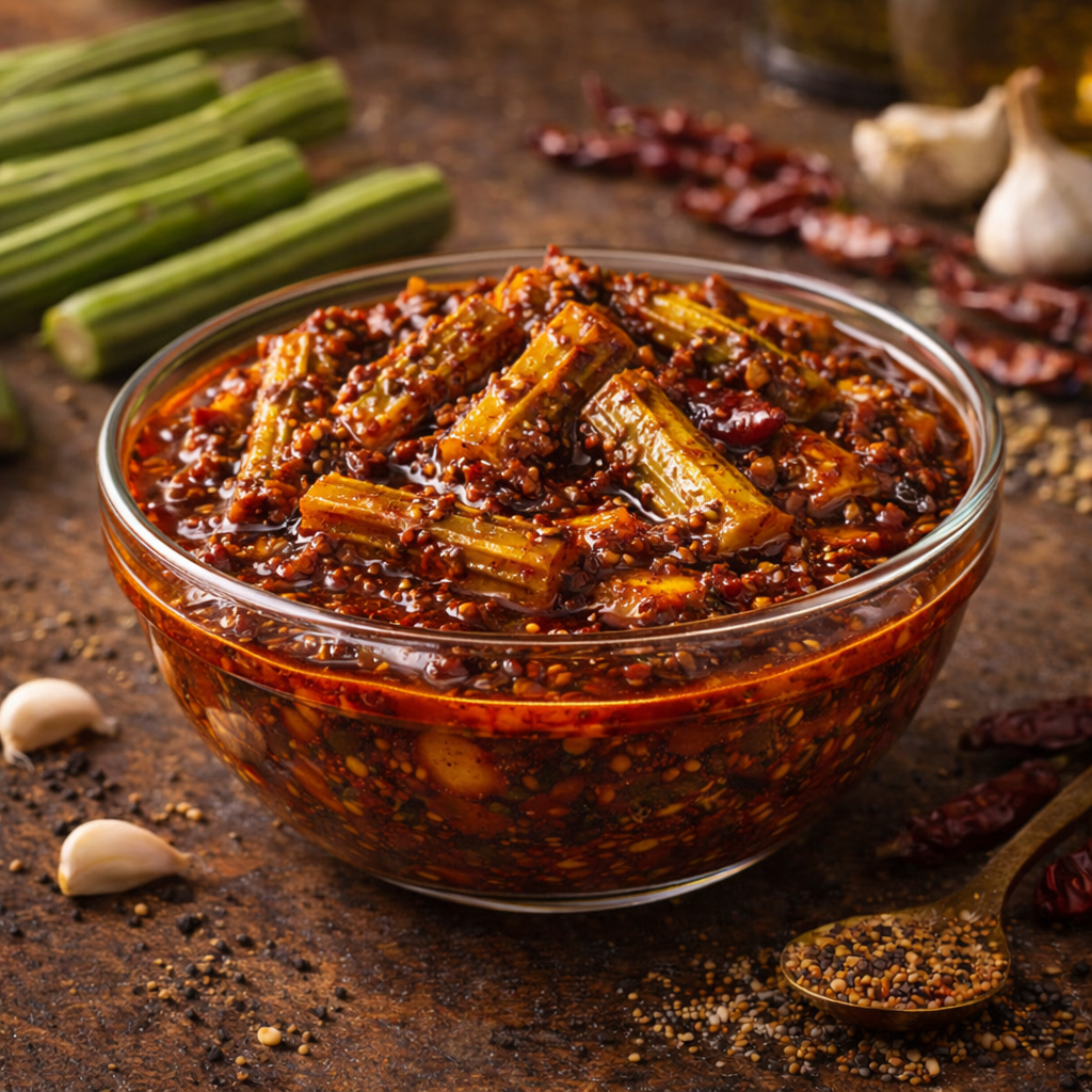Authentic Andhra-style mulakkada (drumstick) pickle made with tender drumstick pieces and traditional spices—rich, spicy, and full of homemade flavor.
