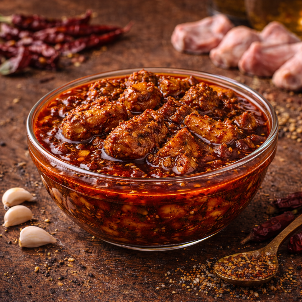 Best enjoyed with hot rice and ghee, dosa, chapati, or as a spicy side dish—bringing the unmistakable taste of traditional mutton pickle to your meals.