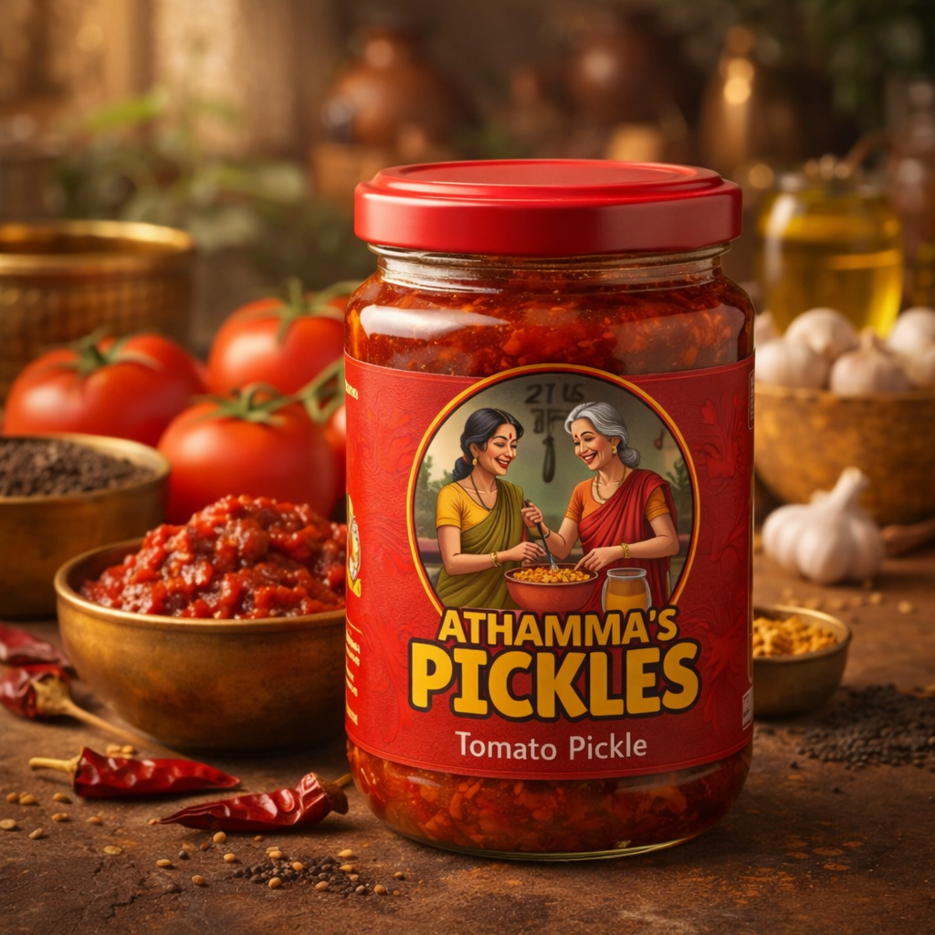 Athamma Pickles Tomato Pickle is prepared using fresh, sun-ripened tomatoes blended with carefully selected spices and traditional seasoning methods. Slow-cooked to perfection, this pickle delivers a balanced taste of tanginess, spice, and rich aroma that complements every meal.